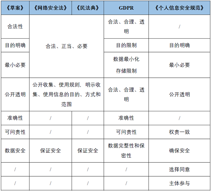 此次發布的《草案》規定了個人信息處理的七大基本原則,分別是合法性原則(第五條)、目的明確原則(第六條)、最小必要原則(第六條)、公開透明原則(第七條)、準確性原則(第八條)、可問責性原則(第九條)、數據安全原則(第九條)。這七大原則與既往的相關法律法規一脈相承,又有新的突破。