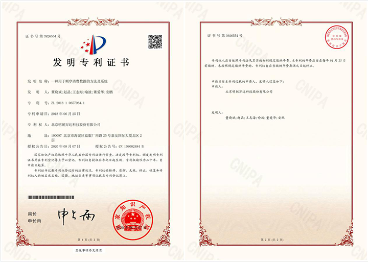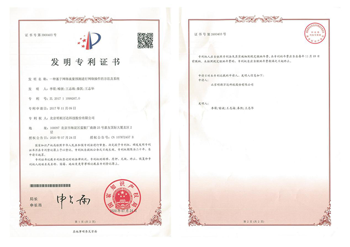 近期,北京明朝萬達科技股份有限公司(以下簡稱“明朝萬達”)自主研發的“一種基于網絡流量預測進行網絡操作的方法及系統”、“一種用于順序消費數據的方法及系統”兩項創新技術順利通過了國家知識產權局的嚴格審查,正式獲得了由國家知識產權局頒發的發明專利證書。