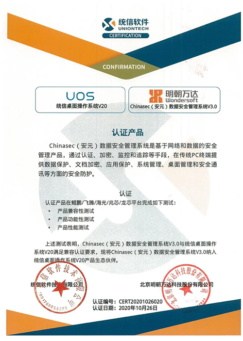 Chinasec(安元)數(shù)據安全管理系統(tǒng)V3.0與統(tǒng)信服務器操作系統(tǒng)V20兼容認證證書