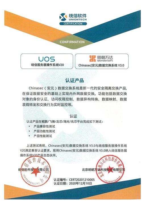 Chinasec(安元)數(shù)據交換系統(tǒng)V3.0與統(tǒng)信服務器操作系統(tǒng)V20兼容認證證書