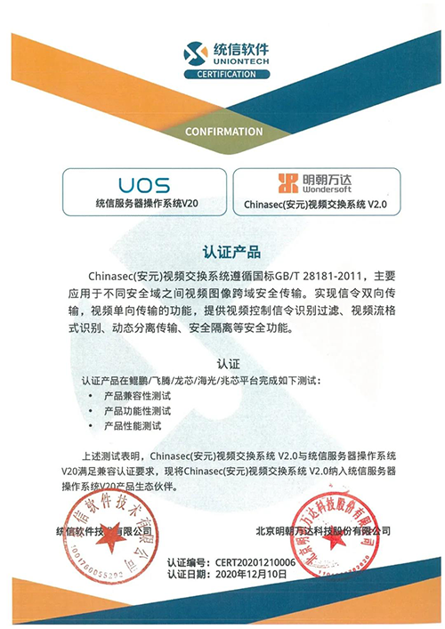Chinasec(安元)視頻交換系統(tǒng)V2.0與統(tǒng)信服務器操作系統(tǒng)V20兼容認證證書
