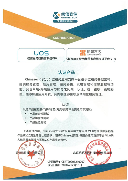 Chinasec(安元)微服務應用支撐平臺V1.0與統(tǒng)信服務器操作系統(tǒng)V20兼容認證證書
