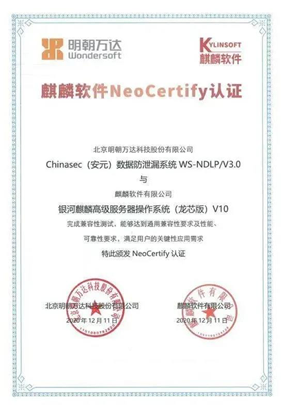 Chinasec(安元)數(shù)據防泄漏系統(tǒng)WS-NDLP/V3.0與銀河麒麟高級服務器操作系統(tǒng)(龍芯版)V10兼容認證證書