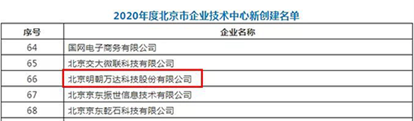 近日,北京市經濟和信息化局正式公布了“2020年度北京市企業技術中心新創建名單”。其中,明朝萬達憑借卓越的技術創新能力成功獲得“北京市企業技術中心”認定。