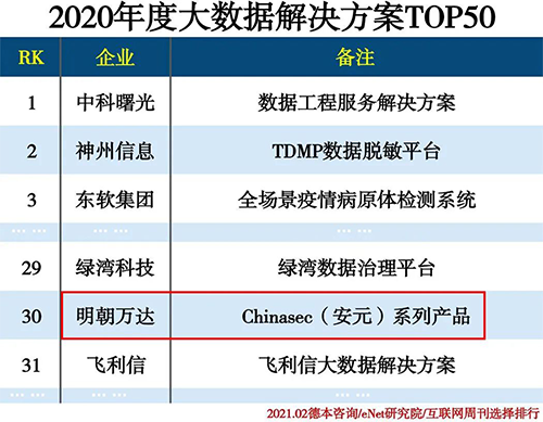 近日,由《互聯網周刊》、德本咨詢、eNet研究院聯合發布的《2020年度大數據解決方案TOP50》榜單正式公布,明朝萬達憑借卓越的技術創新能力以及在大數據安全領域突出表現成功入選。