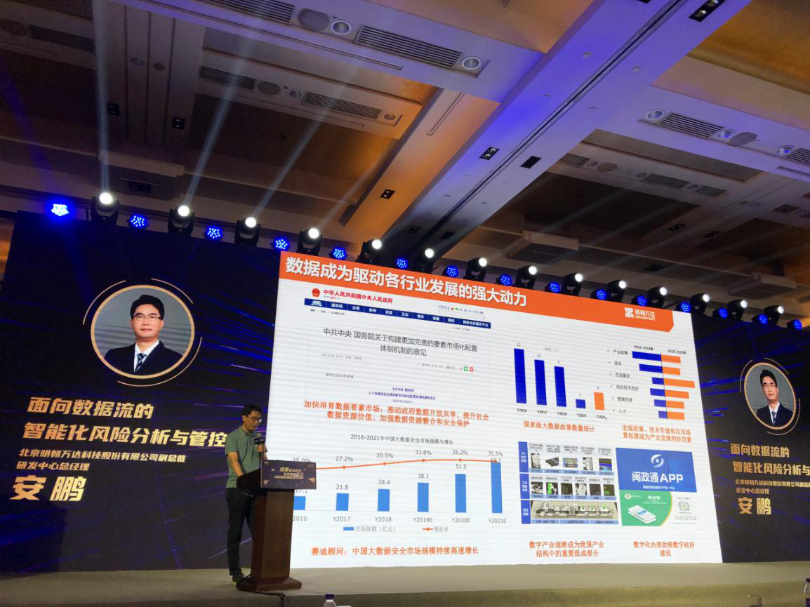 2021年5月20日,2021 IT市場年會暨賽迪生態伙伴大會在北京召開。本屆大會上,北京明朝萬達科技股份有限公司(以下簡稱“明朝萬達”)依托強大的技術創新能力,卓越的商業運作模式,以及領先的市場占有率,榮獲“新一代信息技術創新企業”稱號。同期舉辦了以“場景驅動創新、生態賦能安全”為主題的網絡安全高峰論壇,明朝萬達研發中心總經理安鵬受邀出席并發表題為“面向數據流的智能化風險分析與管控”的演講,與會領導、專家、業界精英們一同討論大數據時代如何使用人工智能技術解決數據安全問題。