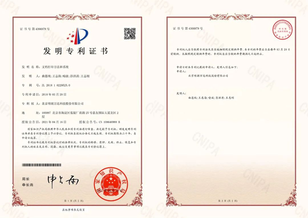 近日,明朝萬達自主研發(fā)的“文檔打印方法和系統(tǒng)”、“文件打印方法、查看方法、裝置、電子設備及可讀存儲介質”、“一種服務器性能測試方法、裝置、設備以及存儲介質”3項創(chuàng)新技術順利通過了國家知識產(chǎn)權局的嚴格審查,正式獲得了由國家知識產(chǎn)權局頒發(fā)的發(fā)明專利證書。