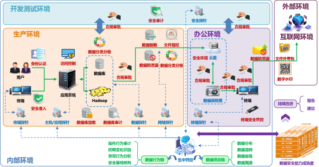 系統控制階段,基于數據全生命周期定義不同分級的數據基本控制策略,制定對敏感數據的檢測規則,建立數據防泄漏保護管理規范及流程,以及對分類規則進行測試及迭代優化。
