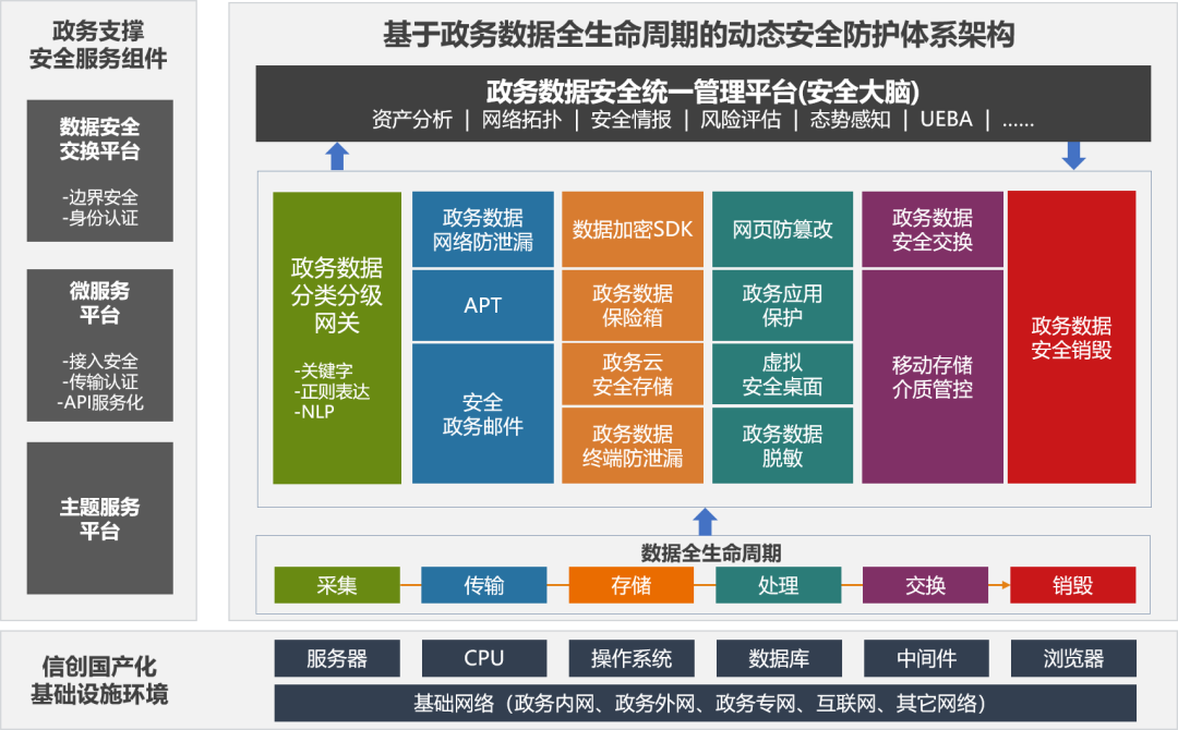 明朝萬達基于信創國產化基礎設施環境,打造覆蓋政務數據全生命周期(采集、傳輸、存儲、處理、交換、銷毀)的安全解決方案,實現“數據可見、風險可視、安全可控”的一體化政務數據安全防護體系。