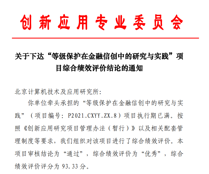 近日,明朝萬達參與的“等級保護在金融信創中的研究與實踐”課題項目順利通過北京金融科技產業聯盟創新應用專業委員會審核,評價“優秀”。