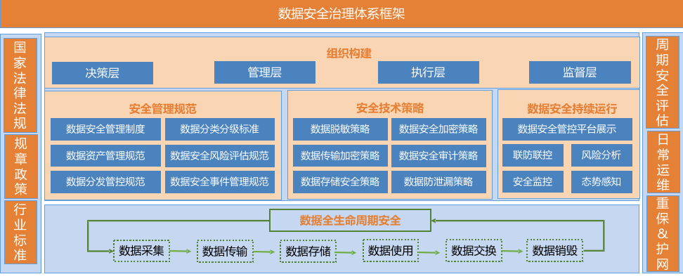 數據安全治理總體框架自上而下貫穿了決策層、管理層、執行層到配合層以及監督層等整個組織架構,包含了從頂層戰略、政策總綱到管理制度、流程規范等各層級的完整制度體系,涉及到整體的技術規劃以及各項技術工具的落地實施。