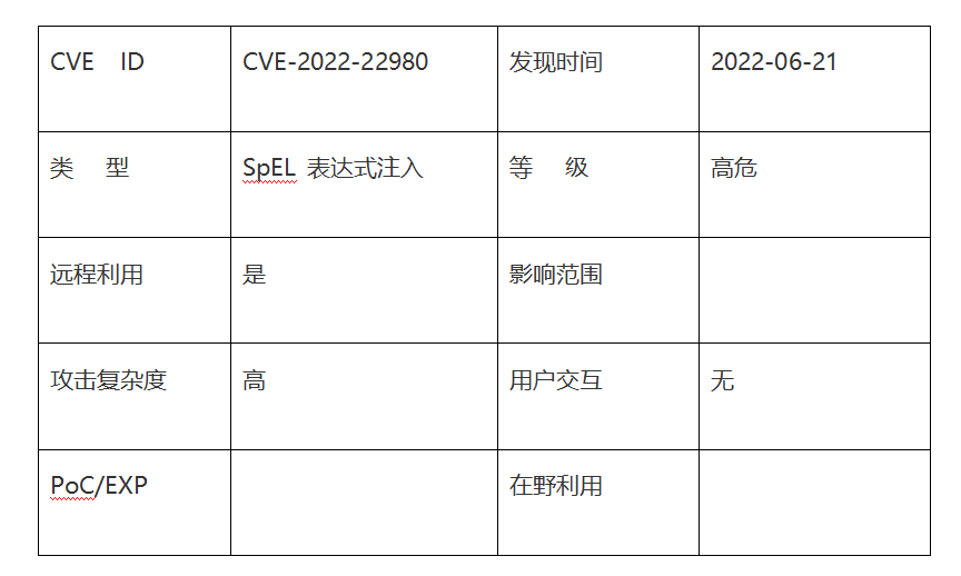 6月20日,VMware發布安全公告,修復了Spring Data MongoDB中的一個SpEL 表達式注入漏洞(CVE-2022-22980),該漏洞的CVSSv3評分為8.2。