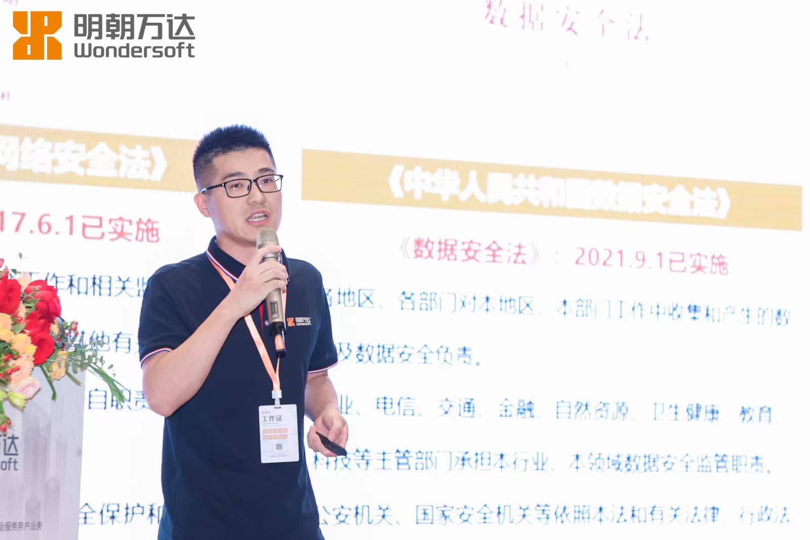 明朝萬達西部大區技術顧問路璐作《數據安全行業建設機會》主題分享。他認為在數字經濟時代,數據安全是助力數字經濟發展的基礎,為此我國制定了一整套監管合規體系,明朝萬達在合規體系的基礎上推出了基于安全服務+平臺工具的一站式數據安全建設服務,采用分期、逐步建設思路,成功的在金融、公安、政府、運營商、醫療和制造等行業落地。