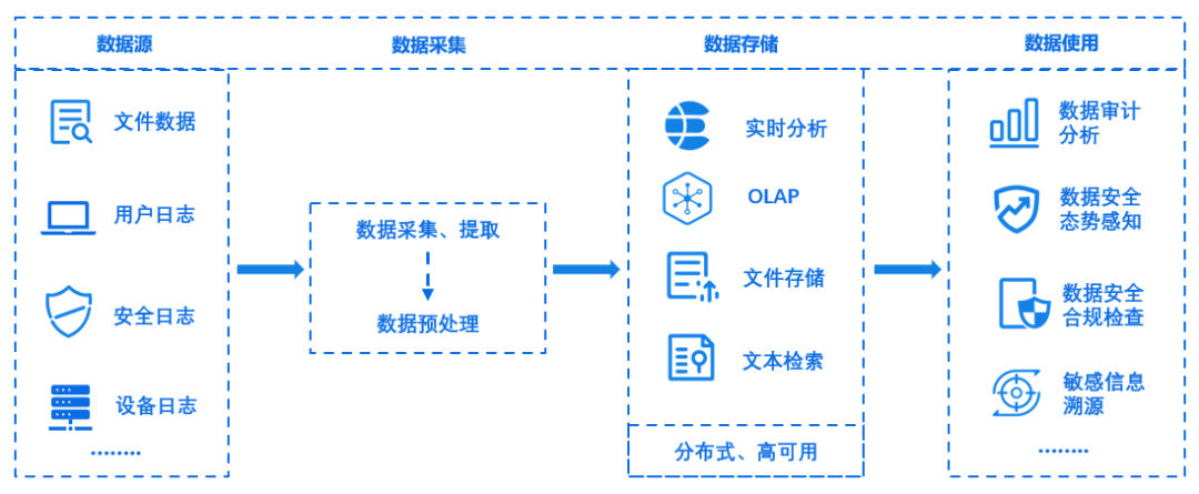 在大數(shù)據(jù)背景下,隨著企業(yè)用戶、業(yè)務(wù)數(shù)據(jù)量的日益增長(zhǎng),數(shù)據(jù)處理場(chǎng)景日趨復(fù)雜,且企業(yè)內(nèi)部數(shù)據(jù)具備多樣性,包含結(jié)構(gòu)化/半結(jié)構(gòu)化、文本數(shù)據(jù)、非結(jié)構(gòu)化數(shù)據(jù)。面對(duì)海量且形式多樣的數(shù)據(jù),急需具備高可用和高性能的存儲(chǔ)方案支持業(yè)務(wù)發(fā)展。數(shù)據(jù)采集作為數(shù)據(jù)生命周期安全管理的第一階段,采集分布在各業(yè)務(wù)應(yīng)用、硬件設(shè)備的數(shù)據(jù),對(duì)數(shù)據(jù)進(jìn)行集中存儲(chǔ)從而打破數(shù)據(jù)孤島,減少企業(yè)用戶在數(shù)據(jù)信息梳理過(guò)程產(chǎn)生的資源浪費(fèi),同時(shí)對(duì)數(shù)據(jù)的一致性、完整性進(jìn)行梳理,提升企業(yè)內(nèi)部信息共享能力。而數(shù)據(jù)存儲(chǔ)作為數(shù)據(jù)安全生命周期中承上啟下的重要環(huán)節(jié),需為數(shù)據(jù)安全合規(guī)檢查、數(shù)據(jù)安全態(tài)勢(shì)分析、敏感數(shù)據(jù)溯源以及異常事件感知等多個(gè)場(chǎng)景提供強(qiáng)有力的數(shù)據(jù)支撐。