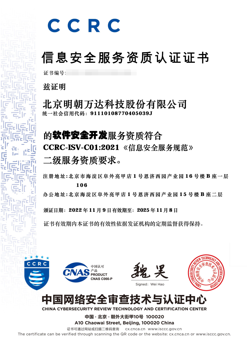 近日,明朝萬達憑借過硬的技術創新實力和優秀的項目實施成果,成功通過中國網絡安全審查技術與認證中心(簡稱“CCRC”)的安全評估,獲得《信息安全服務認證-軟件安全開發二級》認證。