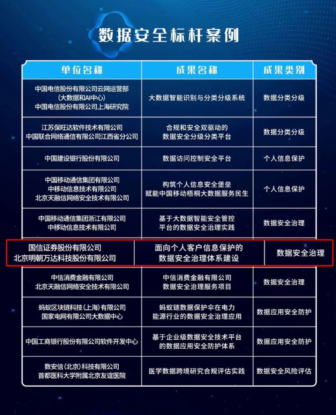 其中,由國信證券股份有限公司(以下簡稱“國信證券”)和北京明朝萬達科技股份有限公司(以下簡稱“明朝萬達”)共同完成的“面向個人客戶信息保護的數據安全治理體系建設”方案經過層層審查和專家評審,被評選為【數據安全標桿案例】。