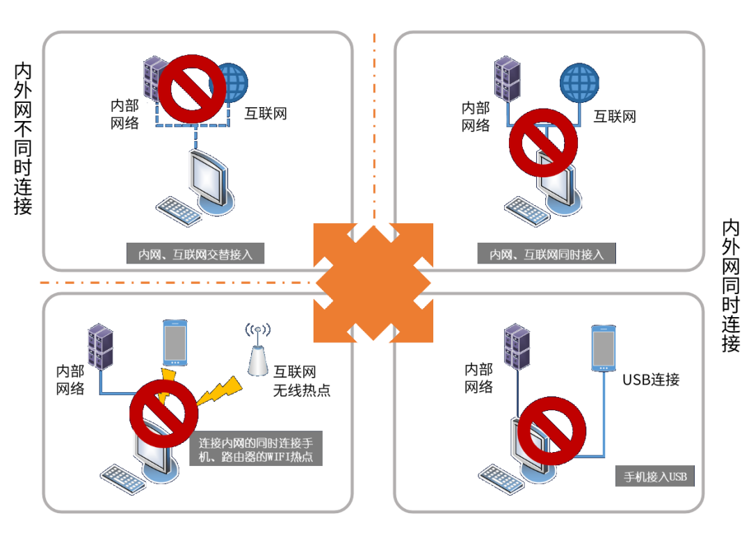 ◆ 內(nèi)網(wǎng)、互聯(lián)網(wǎng)交替接入;◆ 內(nèi)網(wǎng)、互聯(lián)網(wǎng)同時(shí)接入;◆ 連接內(nèi)網(wǎng)的同時(shí)連接手機(jī)、路由器的WIFI熱點(diǎn),從而跳轉(zhuǎn)連接至互聯(lián)網(wǎng);◆ 手機(jī)接入U(xiǎn)SB,導(dǎo)致計(jì)算機(jī)可能通過(guò)手機(jī)網(wǎng)卡連接至互聯(lián)網(wǎng)。“一機(jī)兩網(wǎng)”的存在與關(guān)鍵信息基礎(chǔ)設(shè)施行業(yè)網(wǎng)絡(luò)隔離和計(jì)算機(jī)專網(wǎng)專用的安全要求相違背,風(fēng)險(xiǎn)危害巨大。具體體現(xiàn)在以下方面:
