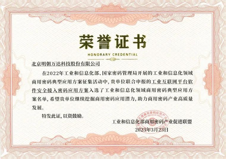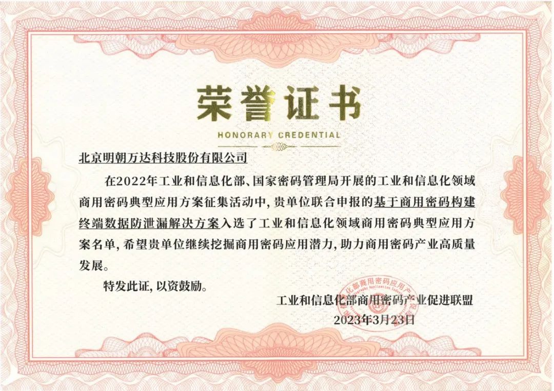 其中,由云南移動和明朝萬達聯合申報的“基于商用密碼構建終端數據防泄漏解決方案”,以及航天云網和明朝萬達聯合申報的“工業互聯網平臺軟件安全接入密碼應用方案”,2項方案成功入選工業和信息化領域商用密碼典型應用方案。