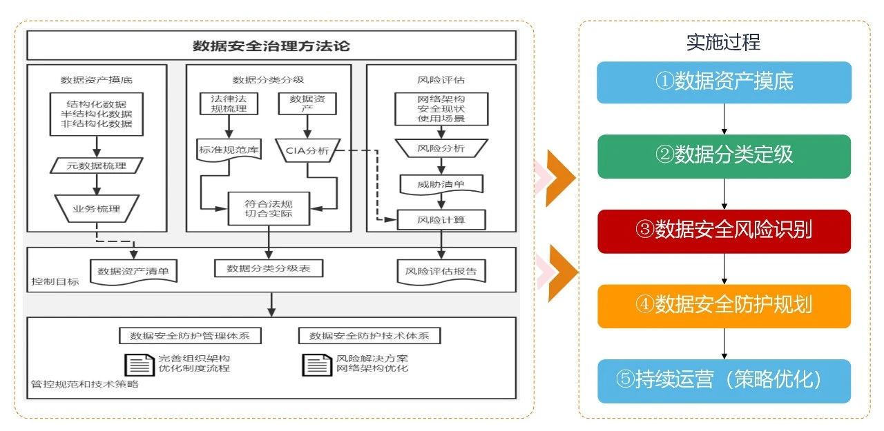數據摸底主要是對結構化、半結構化以及非結構數據進行元數據梳理,結合業務輸出數據資產清單;數據分類分級則是對標相關法律法規,輸出分類分級標準規范,對摸底階段的數據資產進行分類分級,形成分類分級表;數據風險評估是基于企業組織現有的網絡架構、安全現狀以及數據使用場景,采用Stride模型進行數據安全風險分析評估,形成風險評估報告;數據安全防護階段,針對數據分類分級結果,以及風險評估評估報告,構建數據安全管理體系和技術體系;最后是持續運營的過程。