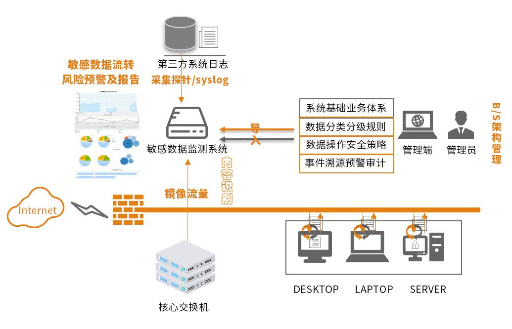 通過在網絡出口部署流轉監測系統產品,采集數據流量并全面分析,實時監測數據流轉情況,識別敏感數據及動態采取響應措施;