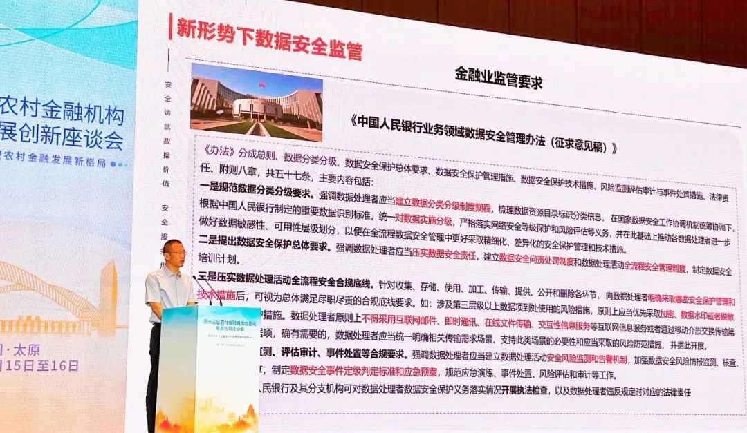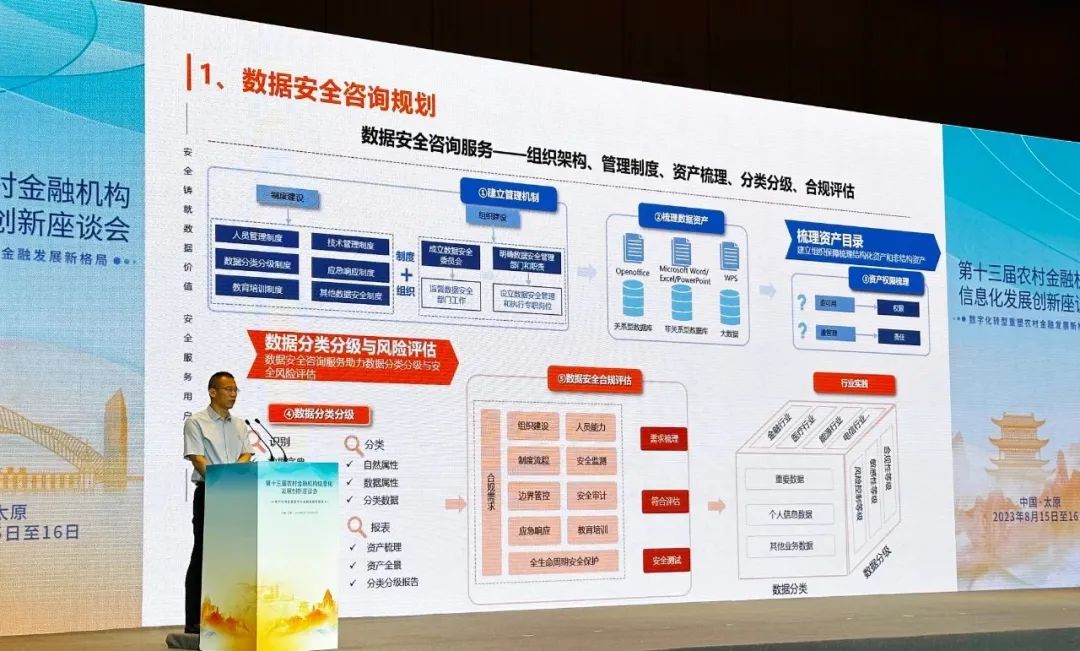 大會開幕當(dāng)天,北京明朝萬達(dá)科技股份有限公司金融事業(yè)部副總經(jīng)理孫加光受邀出席上午的“加快數(shù)字化轉(zhuǎn)型,賦能農(nóng)村金融高質(zhì)量發(fā)展”主題會議,并發(fā)表演講。和與會的專家領(lǐng)導(dǎo)、行業(yè)同仁們分享明朝萬達(dá)全流程數(shù)據(jù)安全建設(shè)方案,介紹了明朝萬達(dá)在金融行業(yè)數(shù)據(jù)安全領(lǐng)域的深入探索以及取得的亮眼成績。