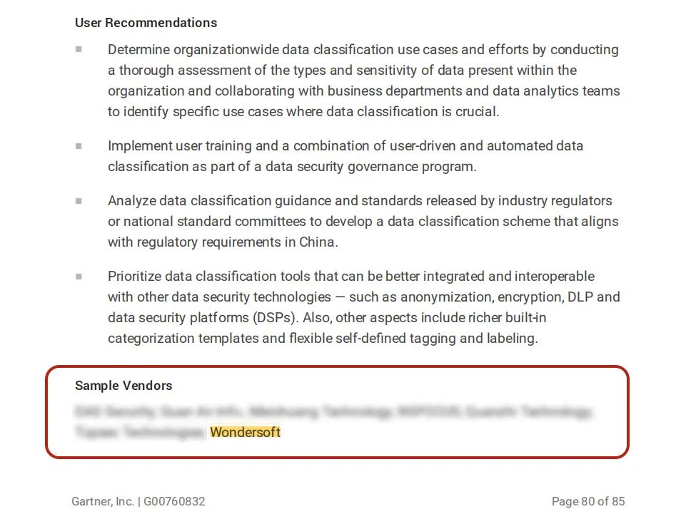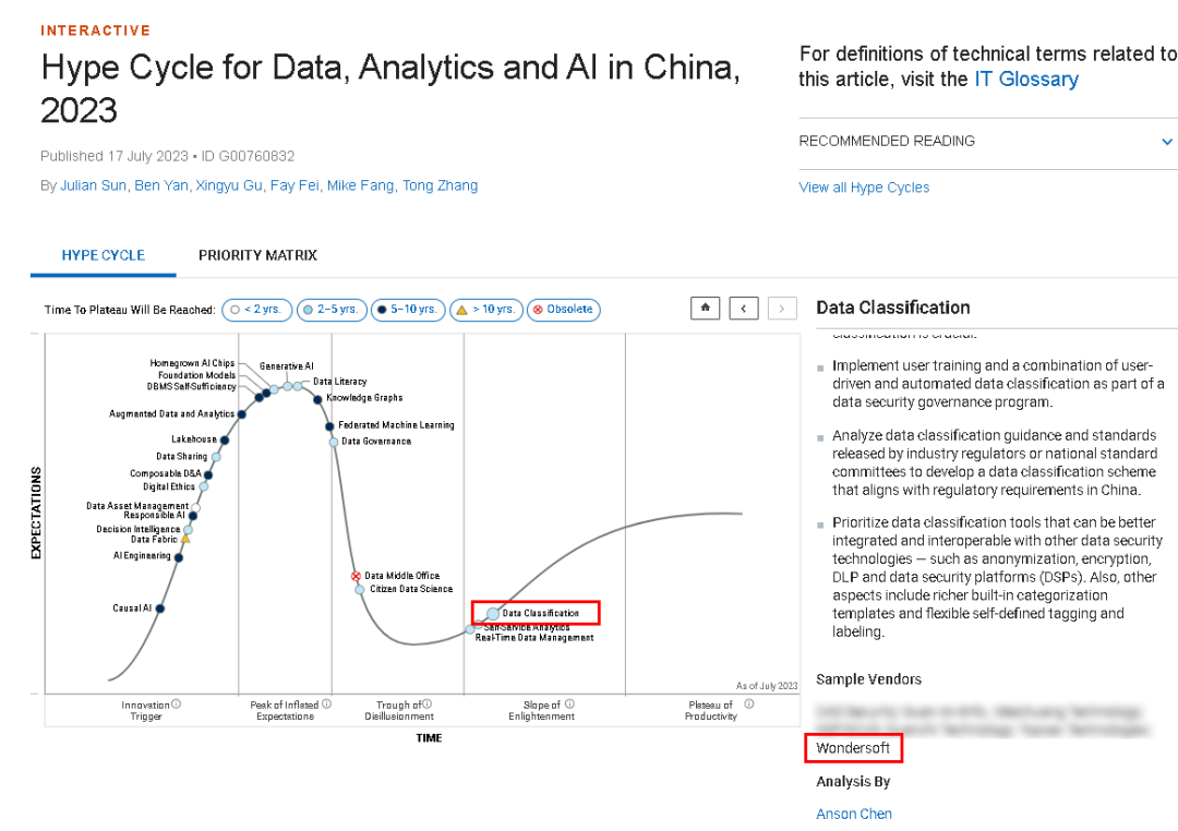 近期, Gartner發布《Hype Cycle? for Data, Analytics and AI in China, 2023》報告,明朝萬達入選其中“數據分類分級”(Data Classification)領域的代表廠商。