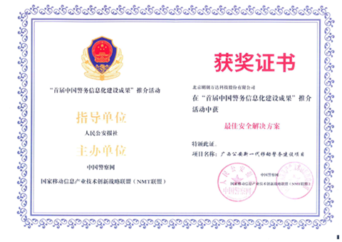 為進(jìn)一步加強(qiáng)警務(wù)信息化建設(shè),更好地解決各地公安機(jī)關(guān)在工作中面臨的實(shí)際問(wèn)題,推進(jìn)“互聯(lián)網(wǎng)+”時(shí)代下警務(wù)信息化的融合發(fā)展,“首屆中國(guó)警務(wù)信息化建設(shè)成果”推介活動(dòng)共征集到來(lái)自全國(guó)128家公安機(jī)關(guān)和企事業(yè)單位報(bào)送的近200項(xiàng)方案。明朝萬(wàn)達(dá)“廣西公安新一代移動(dòng)警務(wù)建設(shè)項(xiàng)目”成功入圍,并最終榮獲“最佳安全解決方案”獎(jiǎng)。