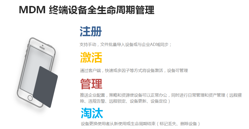 MDM提供了對(duì)移動(dòng)終端設(shè)備的全生命周期的管理: