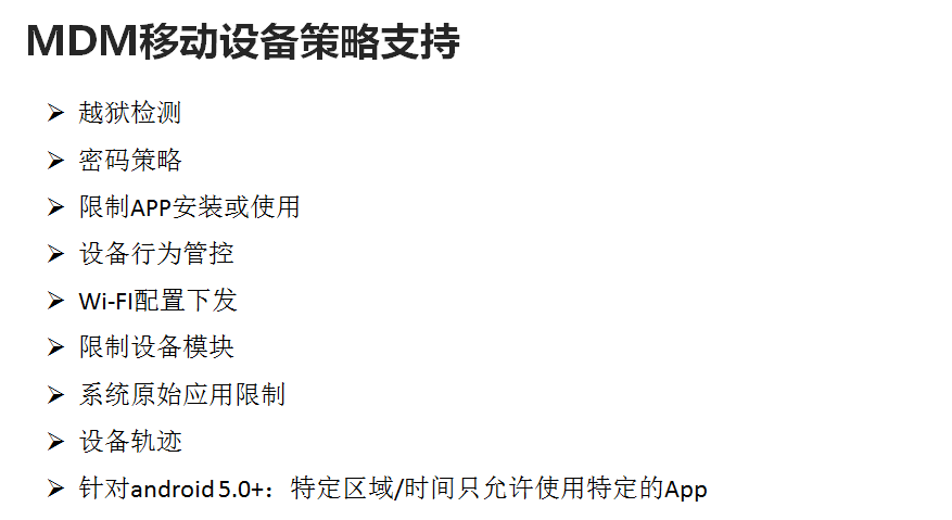 管理:在服務(wù)器端推送企業(yè)配置、策略、資源使設(shè)備可以正常辦公,同時(shí)進(jìn)行日常管理和資產(chǎn)管理(包括遠(yuǎn)程擦除、違規(guī)告警、遠(yuǎn)程鎖定、設(shè)備更新及設(shè)備定位等);