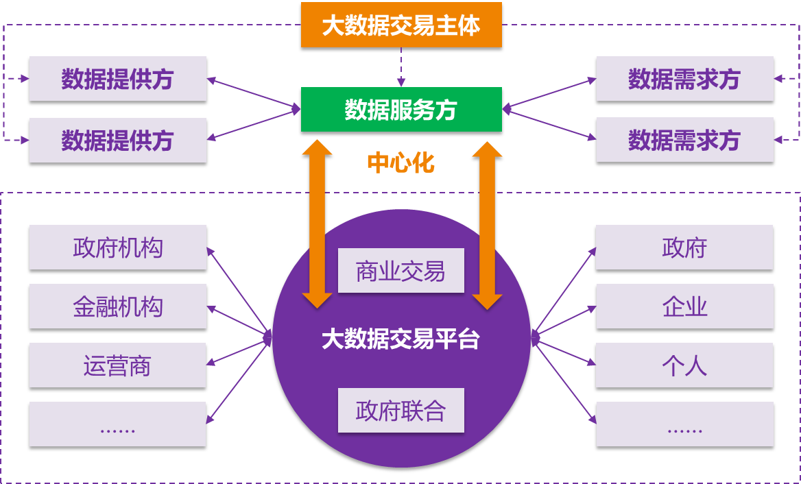 國內(nèi)大數(shù)據(jù)交易平臺主要可以分為兩類:一類是以數(shù)據(jù)生產(chǎn)或數(shù)據(jù)服務類企業(yè)為主導、商業(yè)職能為主的大數(shù)據(jù)交易平臺,另一類是政府聯(lián)合其他主體投資、合作的大數(shù)據(jù)交易平臺。大數(shù)據(jù)交易平臺大多采用中心化系統(tǒng)結構,大數(shù)據(jù)交易主體包括數(shù)據(jù)提供方、數(shù)據(jù)服務方、數(shù)據(jù)需求方,數(shù)據(jù)提供方很少直接面對數(shù)據(jù)需求方,數(shù)據(jù)服務方在整個大數(shù)據(jù)流通和交易過程中,中心支配地位突出。