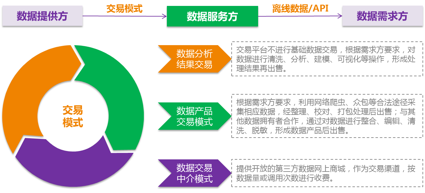 大數(shù)據(jù)交易平臺采用數(shù)據(jù)分析結果交易、數(shù)據(jù)產(chǎn)品交易和數(shù)據(jù)交易中介等三種交易模式,最終數(shù)據(jù)服務方采用離線數(shù)據(jù)或API等方式將交易數(shù)據(jù)提供給數(shù)據(jù)需求方。
