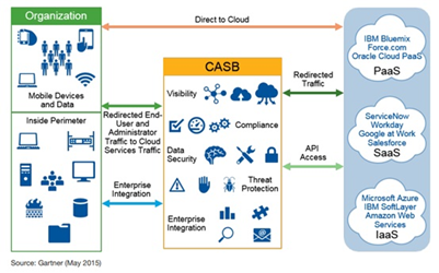 作為部署在云服務(wù)使用者和提供商之間的“經(jīng)紀(jì)人”, CASB(云安全接入代理,cloud access security broker)能夠嵌入企業(yè)安全策略,通過整合云服務(wù)發(fā)現(xiàn)&評(píng)級(jí),單點(diǎn)登錄,設(shè)備&行為識(shí)別,加密,憑證化等多種安全技術(shù),在云上資源被連接訪問的過程中并加以監(jiān)控和防護(hù)。