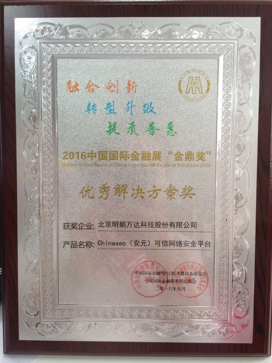 近日,2016中國國際金融展“金鼎獎”獲獎名單新鮮出爐。新一代信息安全服務廠商明朝萬達憑借金融領域數據安全防護硬實力,再次斬獲“金鼎獎”,公司自主研發的Chinasec(安元)系列安全產品,五度榮獲“優秀解決方案獎”,其金融數據安全服務能力可見一斑。