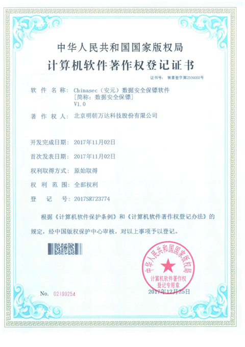 2017年12月,明朝萬達自主研發的“Chinasec(安元)數據安全保鏢軟件V1.0”、“Chinasec(安元)數據安全管理系統?V3.0”兩項產品順利通過了國家版權局中國版權保護中心的嚴格審查,正式獲得了由國家版權局核發的《計算機軟件著作權登記證書》。