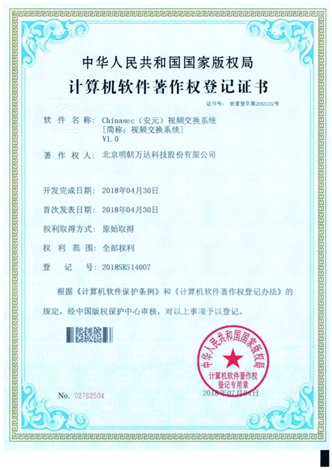 ? ? ? ?近日,明朝萬達自主研發的?“Chinasec(安元)視頻交換系統V1.0”、“Chinasec(安元)數據安全保險箱系統V1.0”兩項產品順利通過了國家版權局中國版權保護中心的嚴格審查,正式獲得了由國家版權局核發的《計算機軟件著作權登記證書》。