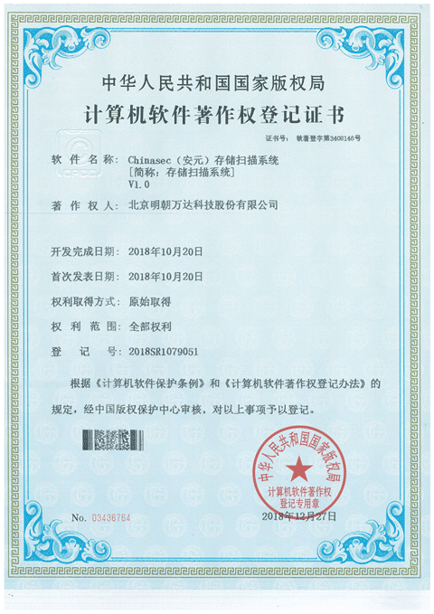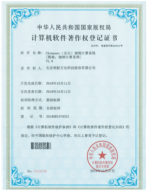 近日,明朝萬達自主研發的“ Chinasec(安元)規則計算系統 V1.0”、“Chinasec(安元)存儲掃描系統 V1.0”兩項產 品順利通過了國家版權局中國版權保護中心的嚴格審查,正式獲得了由國家版權局核發的《計算機軟件著作權登記證書》。