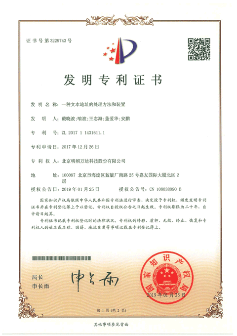 ▲“一種文本地址的處理方法和裝置”發明專利證書