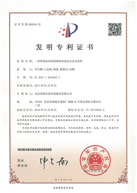 ▲“一種終端訪問控制策略優化的方法及系統”發明專利證書