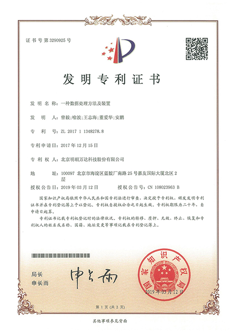 ▲“一種數據處理方法及裝置”發明專利證書