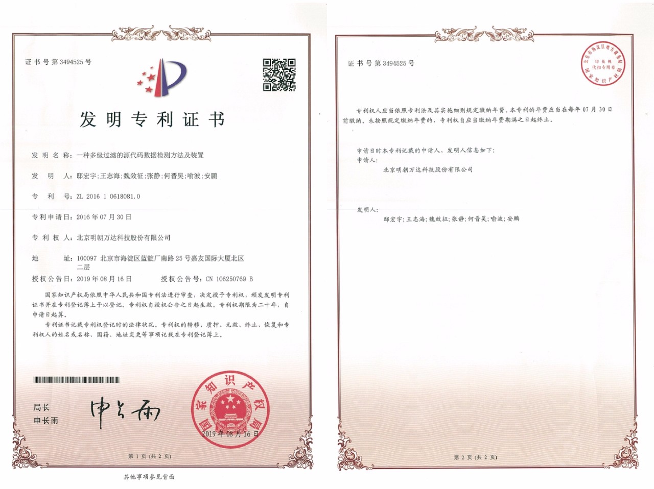 近日,明朝萬達自主研發(fā)的“一種多級過濾的源代碼數(shù)據(jù)檢測方法及裝置”創(chuàng)新技術順利通過了國家知識產權局的嚴格審查,正式獲得了由國家知識產權局頒發(fā)的發(fā)明專利證書。