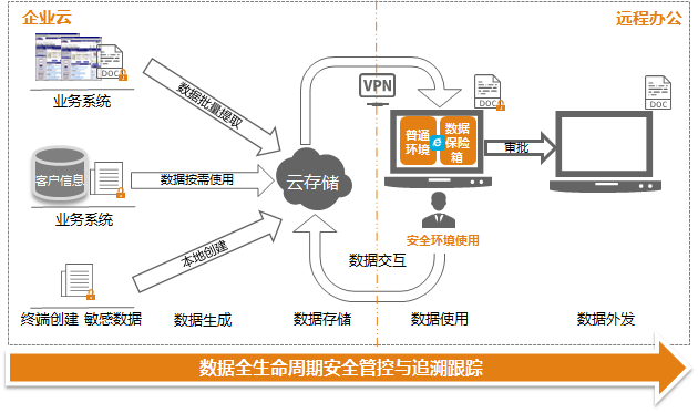 3) 遠程隔離訪問:僅限數據保險箱統一訪問隔離區(云存儲和本地安全保險箱),數據操作不落地;