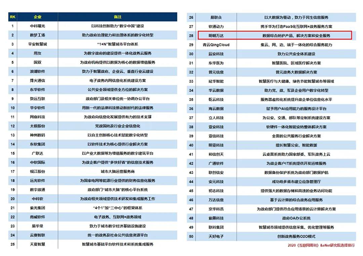 2020年6月,由《互聯網周刊》&eNet研究院聯合發布的“2020電子政務提供商50強”名單正式公布。明朝萬達上榜,躋身中國電子政務提供商第一陣營。