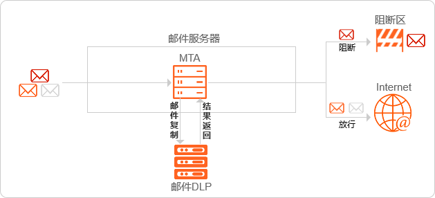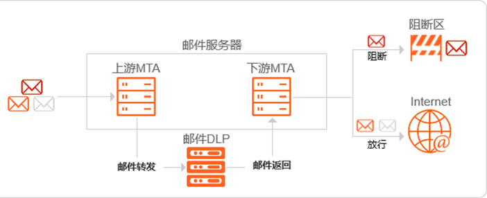 MTA級聯方式是將郵件DLP邏輯串聯在郵件服務器上游MTA和下游MTA之間。