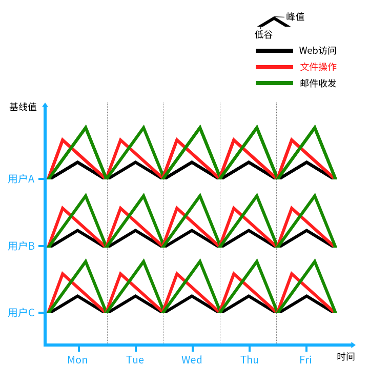 △ 本圖展示了3個(gè)用戶(hù)的個(gè)體行為基線,包括郵件收發(fā)、文件操作和web訪問(wèn)三個(gè)業(yè)務(wù)操作場(chǎng)景。將用戶(hù)行為進(jìn)行縱向分析計(jì)算,可得到部門(mén)行為基線。